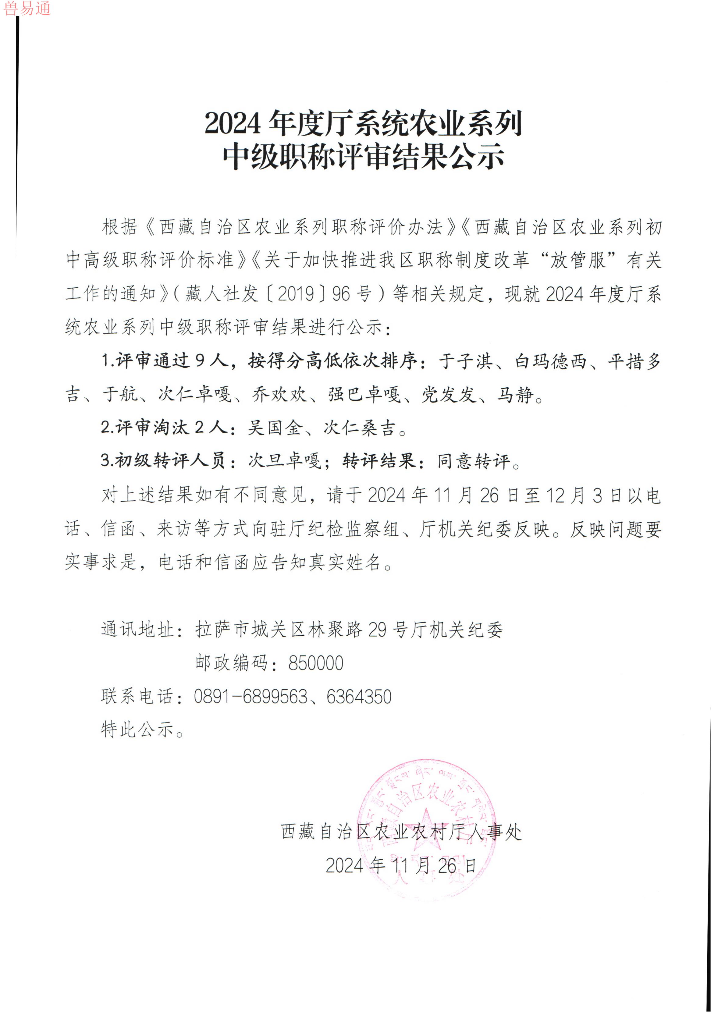 按照《全国执业兽医资格考试西藏考区领导小组公告(第14号)》要求,我办对申请授予执业兽医资格的人员进行了审核,确认拟授予执业兽医资格人员29人,现予公示(名单附后)。若对公示人员持有异议,请通过信函、电话等方式向我办进行反映。联系电话:0891-6364692 全国执业兽医资格西藏考区领导小组办公室 2019年4月12日 2018年执业兽医资格授予 审核通过人员名单公示