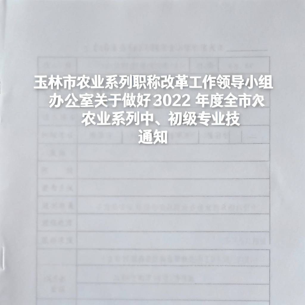根据《广西壮族自治区农业系列职称改革工作领导小组办公室关于做好2022年度全区职称评审工作的通知(桂农业职办〔2022〕1号)和《玉林市职称改革工作领导小组办公室关于做好2022年度全市职称评审工作的通知》(玉职办〔2022〕4号)等文件精神,结合我市农业行业工作实际情况,现就开展2022年度我市农业系列中、初级专业技术资格评审工作有关事项通知如下: