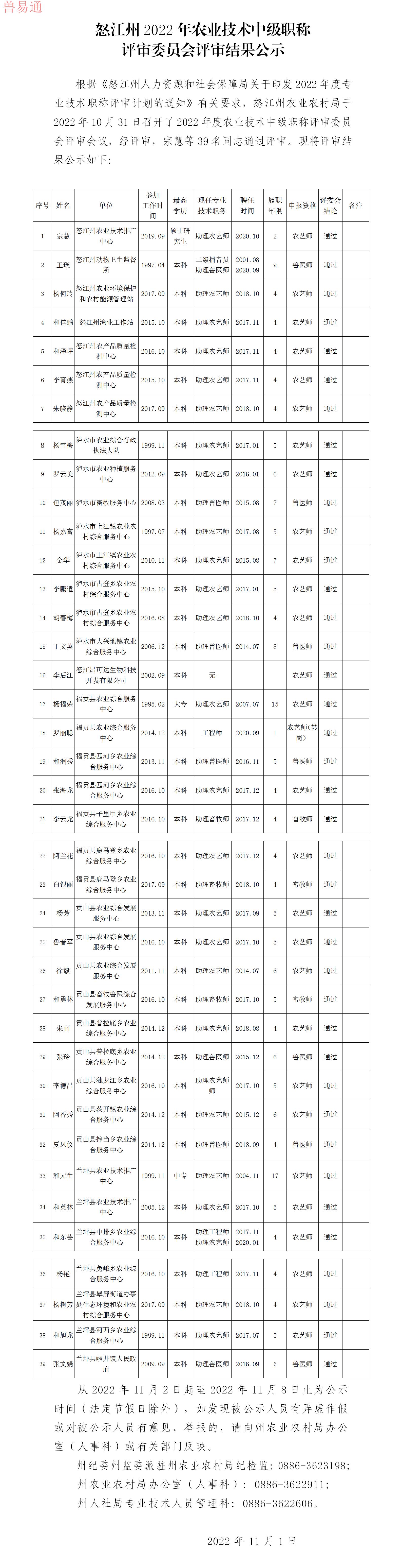 高级职称评审工作文件的通知》要求,怒江州农业农村局组织开展了2020年度农业系列高级职称评审工作,通过基层单位推荐、主管部门审核、人社部门审核等程序,同意推荐利惠英等39同志申报2020年农业系列高级职称评审。现将申报人员有关情况公示如下:序号姓名单位出生年月参加工作时间最高学历现任专业技术职务聘任时间履职年限申报资格1