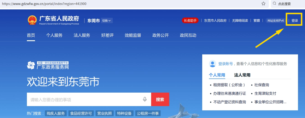 1. 在电脑端输入网址https://www.gdzwfw.gov.cn/portal/index?region=441900,点击页面右上方的“登录”。
