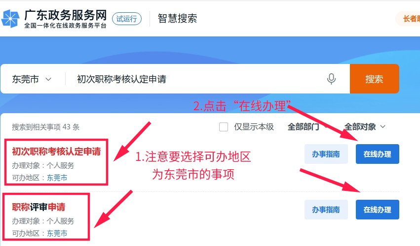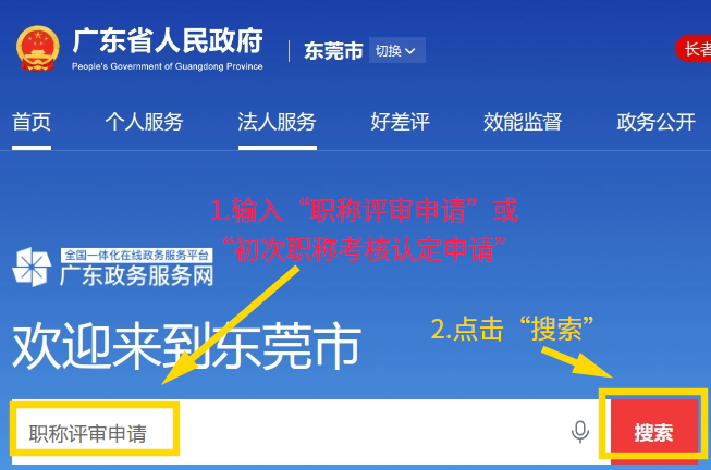 第二步:线上申报。申报人登录“广东政务服务网”门户网站(网址https://www.gdzwfw.gov.cn/portal/index?region=441900)在搜索栏输入“职称评审申请”或“初次职称考核认定申请”选择对应的事项并根据系统指引进行网上申报。