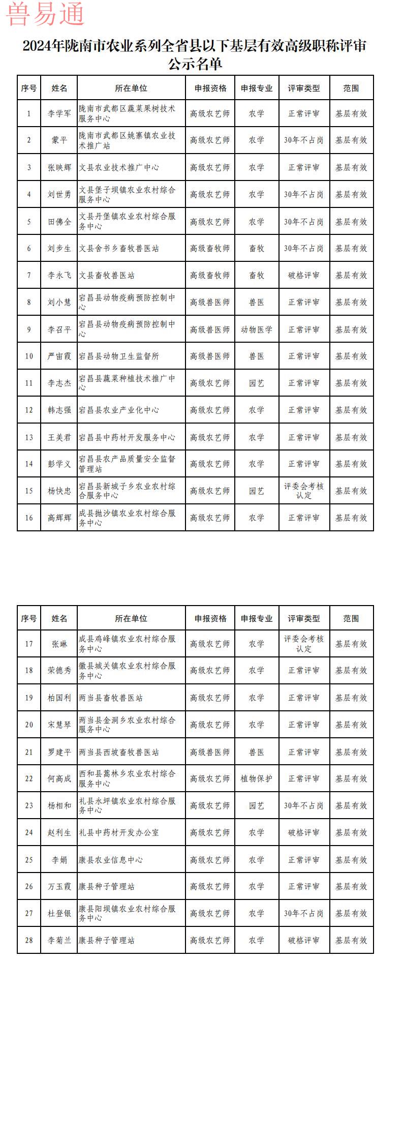 陇南市2024年农业系列县以下基层高级职称评审会于2024年12月14日至15日召开。经评审委员会评审通过,李学军等28名同志具备农业系列县以下基层有效高级职称资格。现予以公示,接受全社会监督。