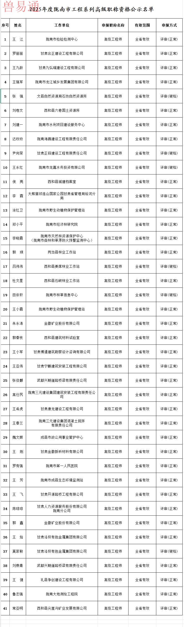 经陇南市工程系列高级职称评审委员会12月6日至12月7日评审通过,王江等41名同志拟晋升工程系列高级职称资格。现予以公示,接受全社会监督。公示期间如对评审结果有异议,请以书面形式实名反映至市人力资源和社会保障局、市林业和草原局,凡匿名或假冒他人姓名反映问题的、未提供可查证线索的、逾期提供证据材料的不予受理。