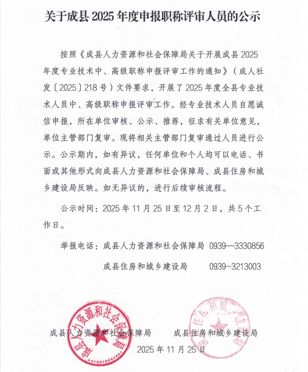 高级职称评审委员会会议评审通过,杨俊林等28名同志具备县以下基层高级工程师职称资格。现将评审结果予以公示。公示期间,如对评审结果有异议,请以书面形式向陇南市职改办和陇南市林业和草原局反馈,公示受理期5个工作日。监督电话:市职改办:0939-8219208市林草局:0939-8232974公示时间:2023年12月4日至2023年12月8日。