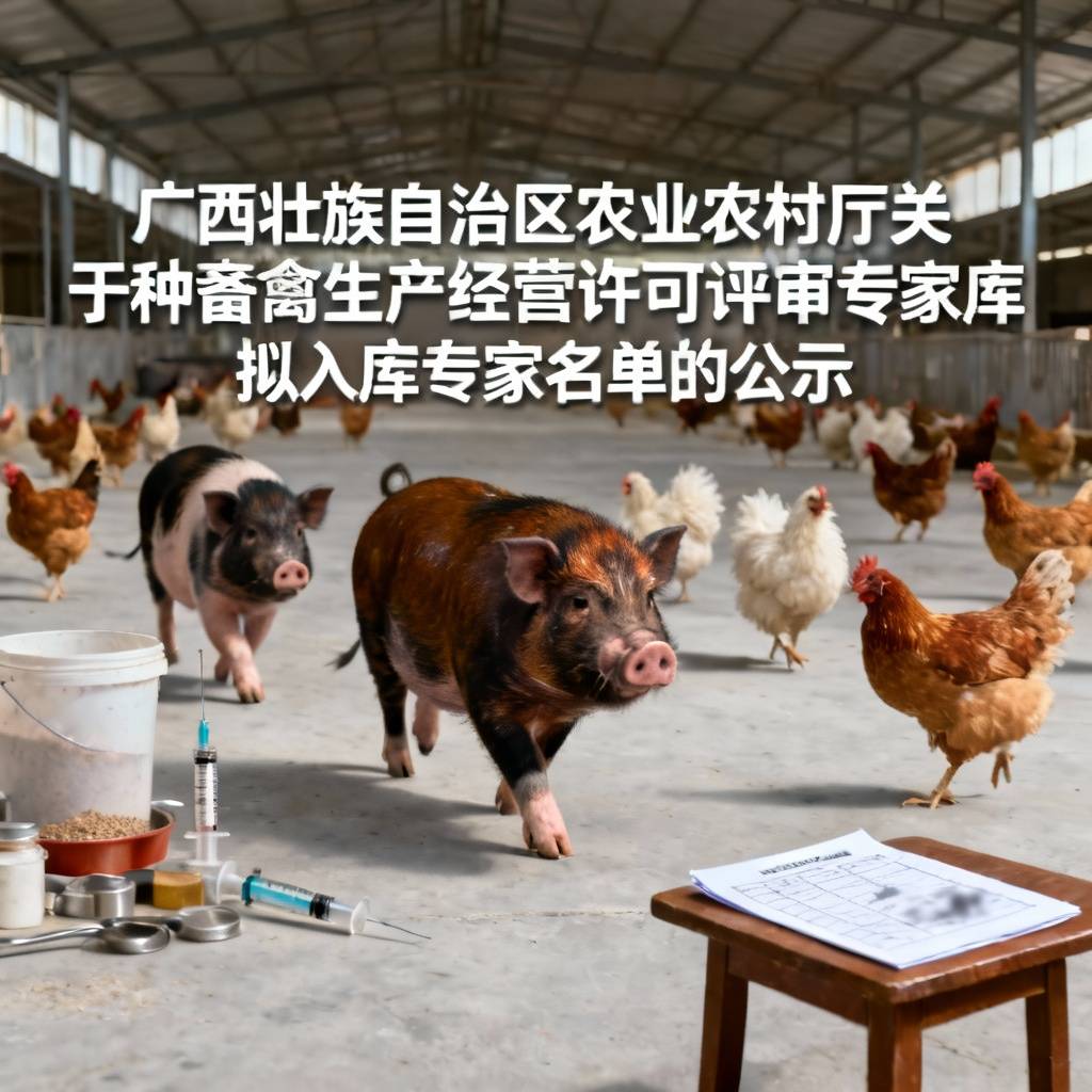 根据《广西壮族自治区农业农村厅关于征集种畜禽生产经营许可评审专家库专家的通知》(编号:GNTB20250408)要求,经个人申请、单位推荐、资格审核和专家评审,现将广西种畜禽生产经营许可评审专家库拟入库专家名单予以公示。公示时间为2025年12月22日至2025年12月26日,共5个工作日。