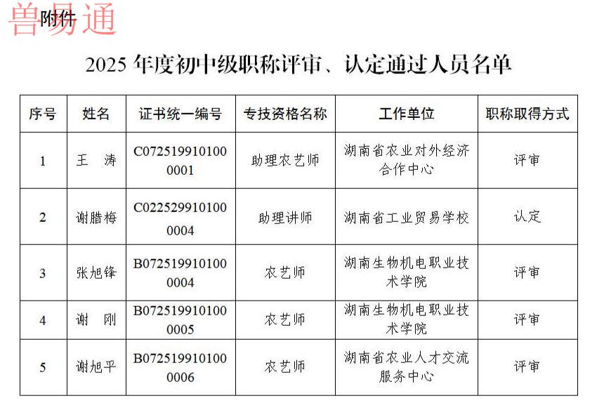 经省农业系列初中级专业技术职称评审委员会评审,省农业系列职称改革工作领导小组审定,省人社厅备案,同意确认王涛同志农业系列初级职称、谢刚等3位同志农业系列中级职称,确认时间为2025年11月28日。