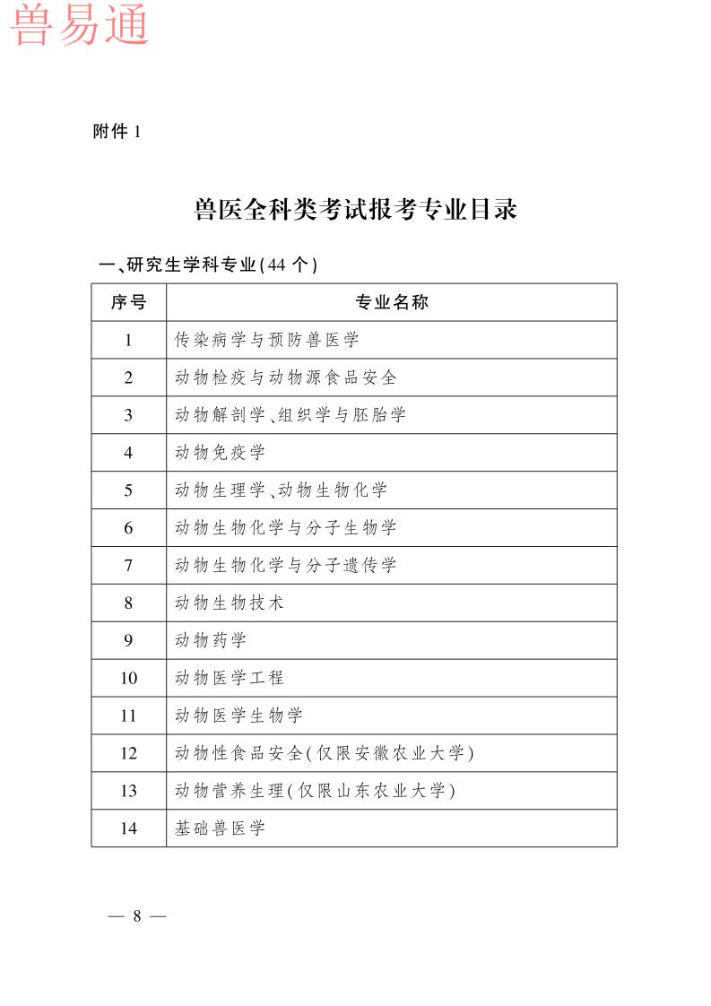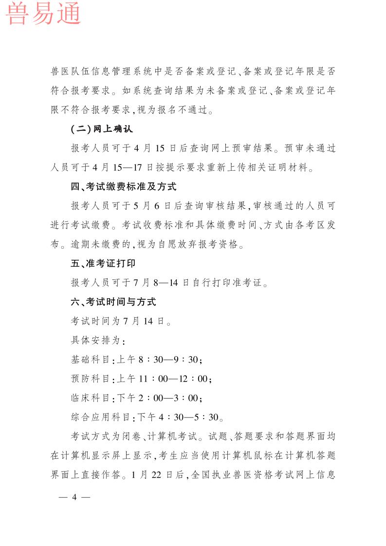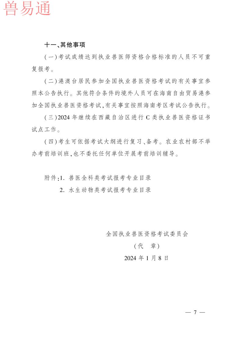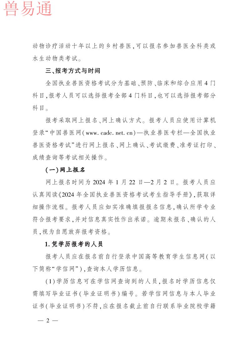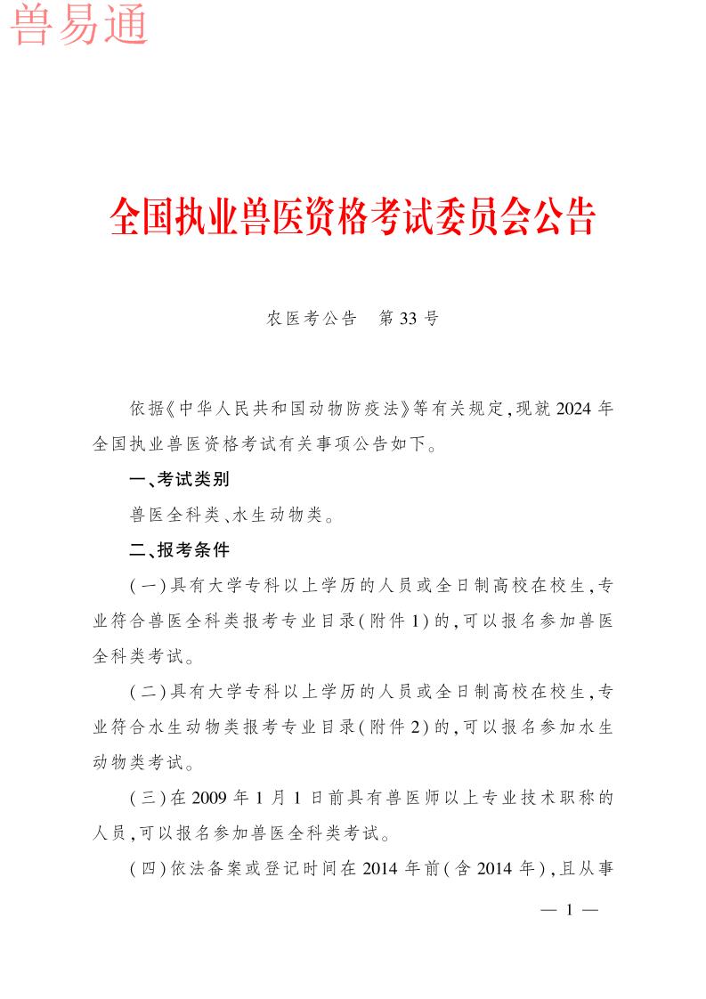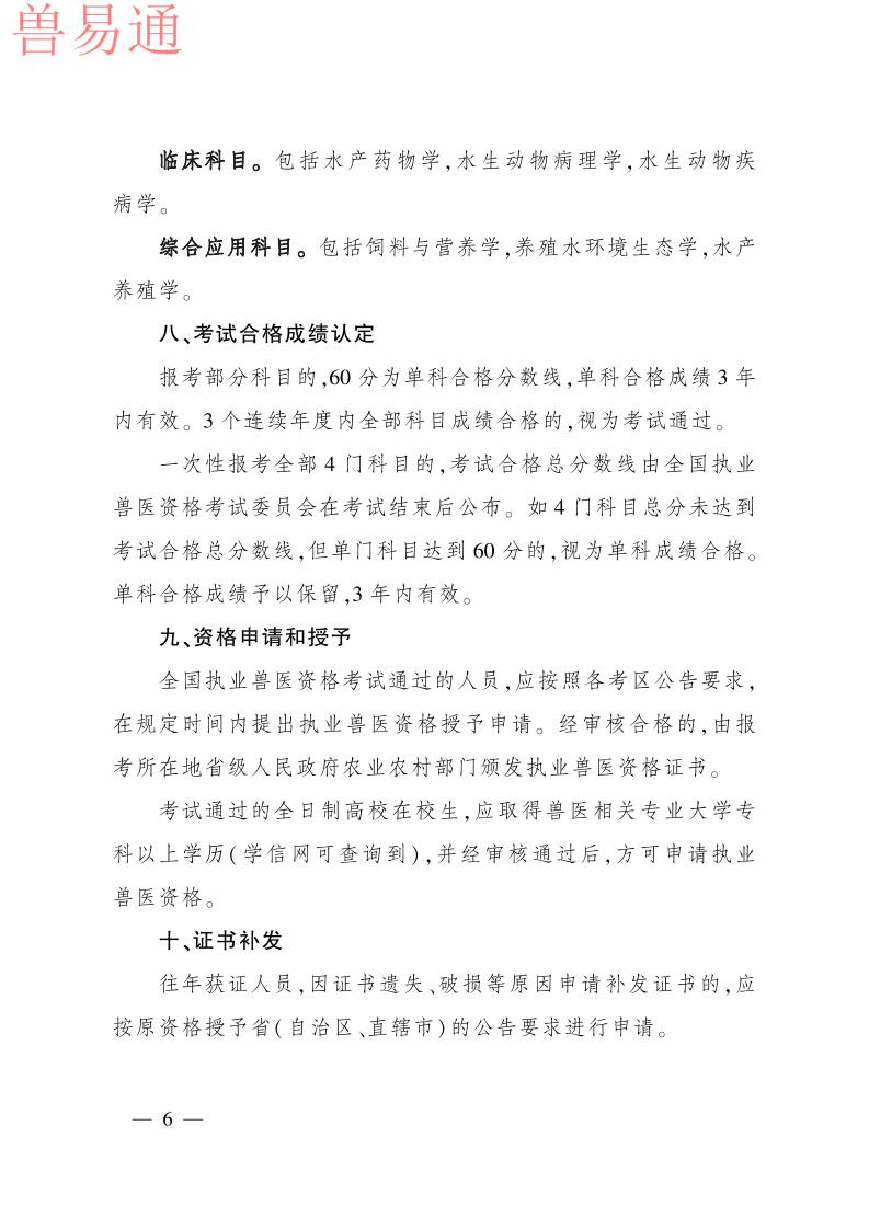 根据《执业兽医管理办法》规定,现将2021年全国执业兽医资格考试成绩公布时间、合格分数线及执业兽医资格授予等事项公告如下。 一、成绩公布与查询 2021年全国执业兽医资格考试成绩将于2022年1月14日公布。考生可在中国兽医网(http://www.cadc.net.cn)“全国执业兽医资格考试网上信息平台”查询成绩。 二、合格分数线 2021年全国兽医全科类执业兽医师和执业助理兽医师合格