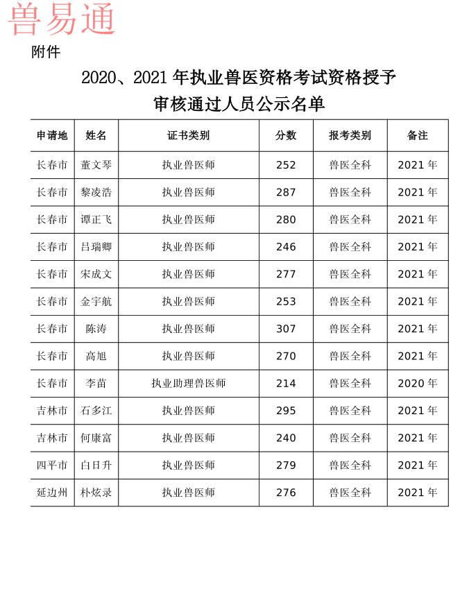 按照《吉林省执业兽医资格考试领导小组办公室第23号公告》要求,经考生网上申请、资格审核确认,拟授予董文琴等13名考生执业(助理)兽医师资格。现予以公示,欢迎社会各界监督。 如对公示对象有异议,请在公示期内与吉林省畜牧业管理局兽医药政处联系。 公示时间:2023年8月21日至8月28日 监督电话:0431-88906671 附件:2020、2021 年执业兽医资格考试资格授予审核通过人员公示名单 吉林省畜牧业管理局 2023年8月21日
