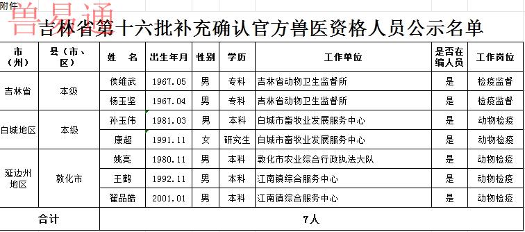 附件:吉林省第十六批补充确认官方兽医资格人员公示名单