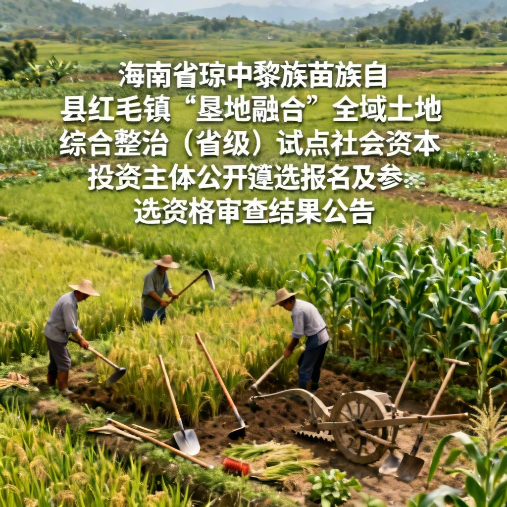 为做好海南省琼中黎族苗族自治县红毛镇“垦地融合”全域土地综合整治(省级)试点的工作,我单位于2024年7月8日在琼中黎族苗族自治县人民政府网站、红毛讯窗微信公众号、海南省“土地超市”等媒介上发布《海南省琼中黎族苗族自治县红毛镇“垦地融合”全域土地综合整治(省级)试点的社会资本投资主体公开遴选公告》。