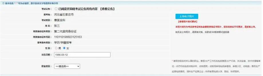 报考人员应阅读报考地公告,确认已经阅读并知晓公告内容。填报性别、出生日期、职业类别,上传本人电子照片。其中: