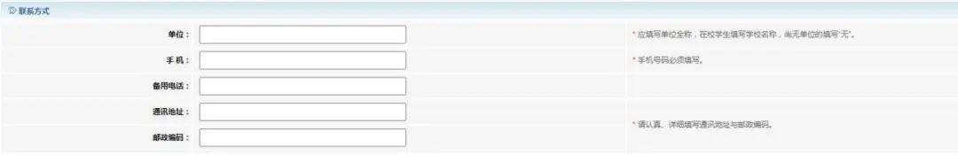手机号码、备用电话、通讯地址、邮政编码必须填写。