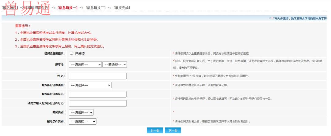 信息填报界面分为两个部分。“信息填报一”中,应填报报考地,姓名,有效身份证件类别,有效身份证件号码,考试类别、报考条件类别。其中: