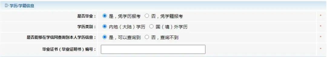 报名时,在“是否毕业”一览,选择“是,凭学历报考”。“是否能够在学信网查询到本人学历信息”一栏,选择“是”,并填写毕业证书(毕业证明书)编号。