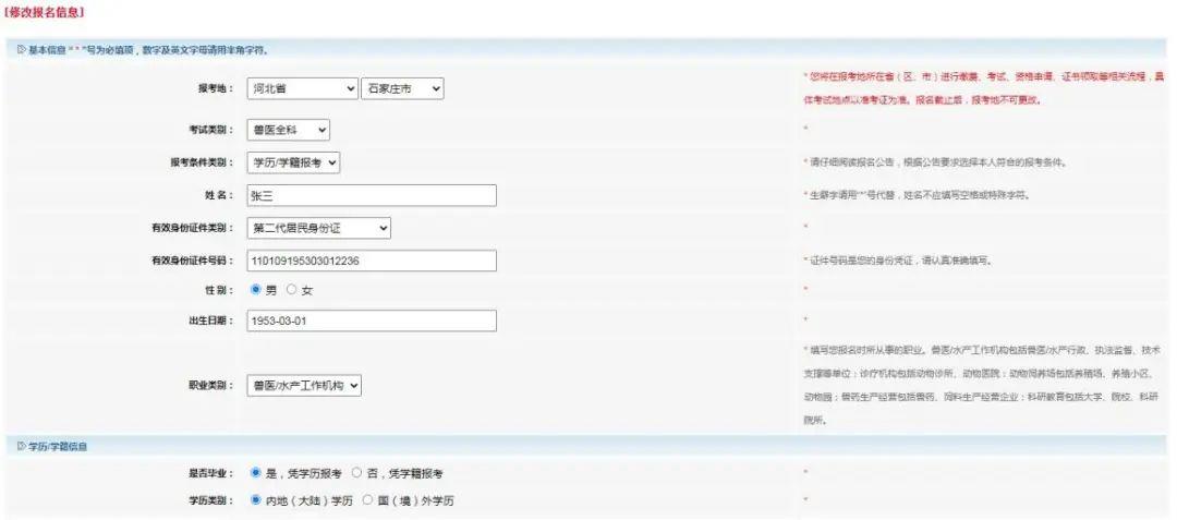 报考人员进入网上报名界面后,首先查看全国执业兽医资格考试流程示意图,全面了解考试流程。网上报名截止后,所有填报信息不可更改。