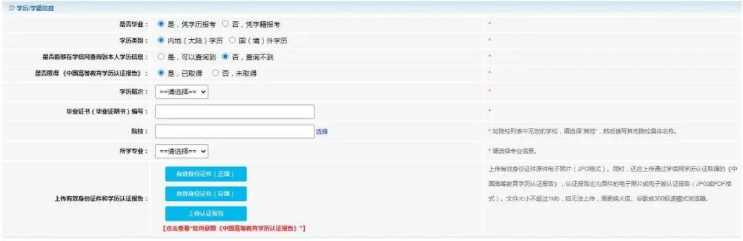 报名时,在“是否毕业”一栏,选择“是,凭学历报考”。“是否能够在学信网查询到本人学历信息”一栏,选择“否”。填选“学历层次”、“毕业证书(毕业证明书)编号”、“院校”、“所学专业”,并上传有效身份证件和《中国高等教育学历认证报告》原件的电子照片或电子版认证报告。