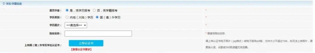 报名时,“学历类别”选择“国(境)外学历”,填选“学历层 次”、“院校名称”,并上传学历学位认证书电子照片或电子版认证书。