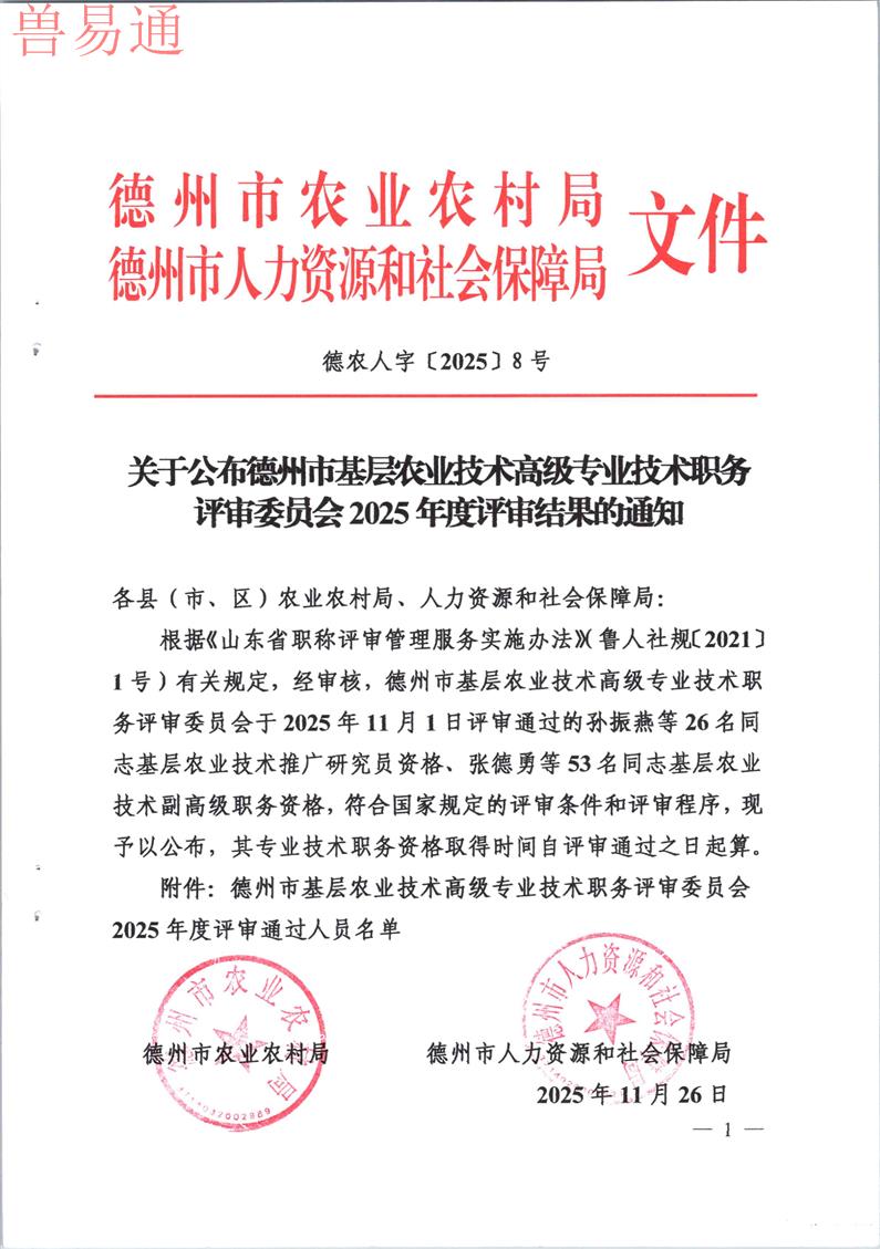 各县(市、区)农业农村局、人力资源社会保障局,天衢新区社会事务管理部:根据德州市人力资源和社会保障局《关于开展2025年度职称评审工作的通知》要求,依据《山东省新型职业农民职称评价标准条件(试行)》《山东省新型职业农民职称评审办法(试行)》等有关规定,为做好德州市2025年度新型职业农民