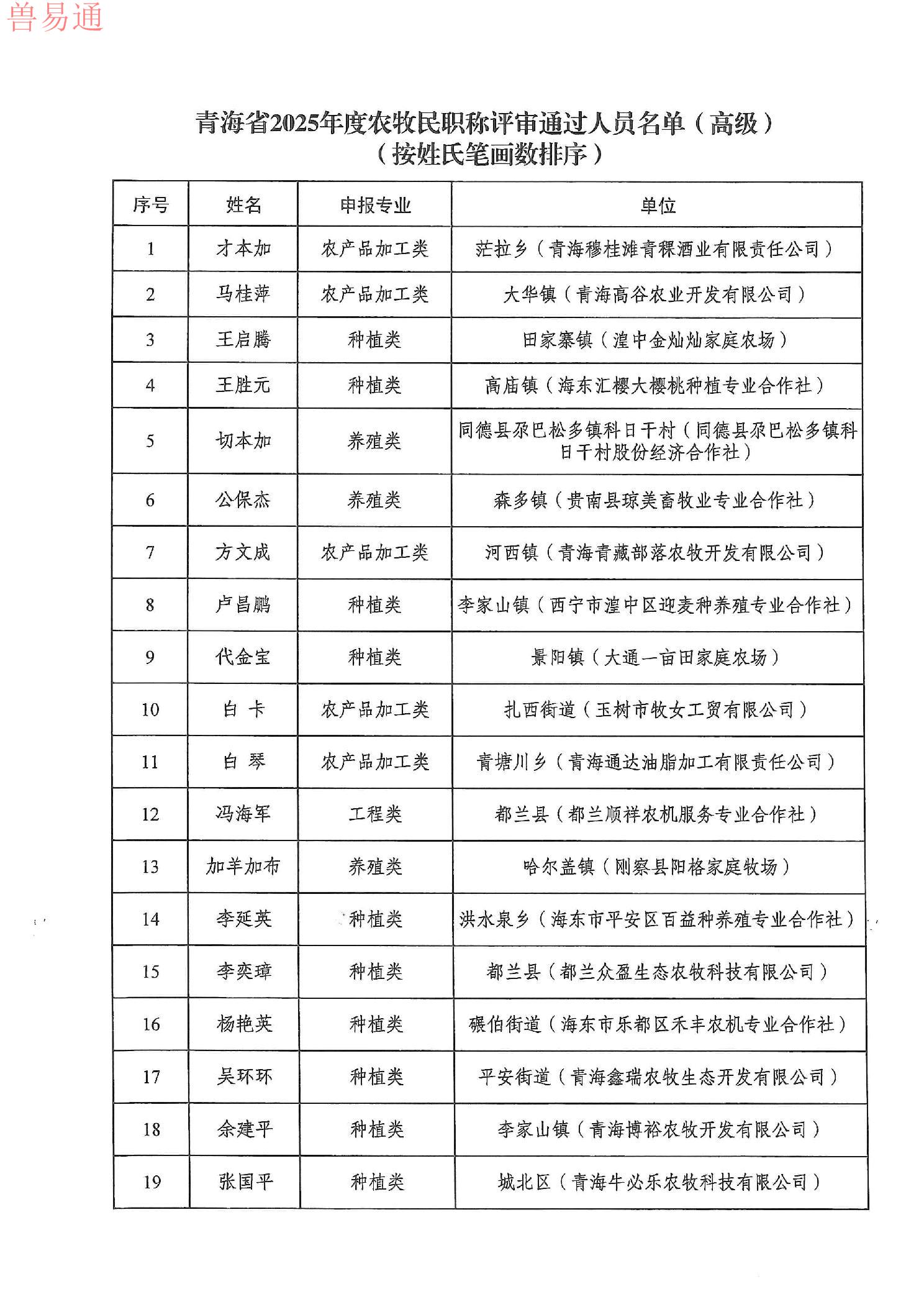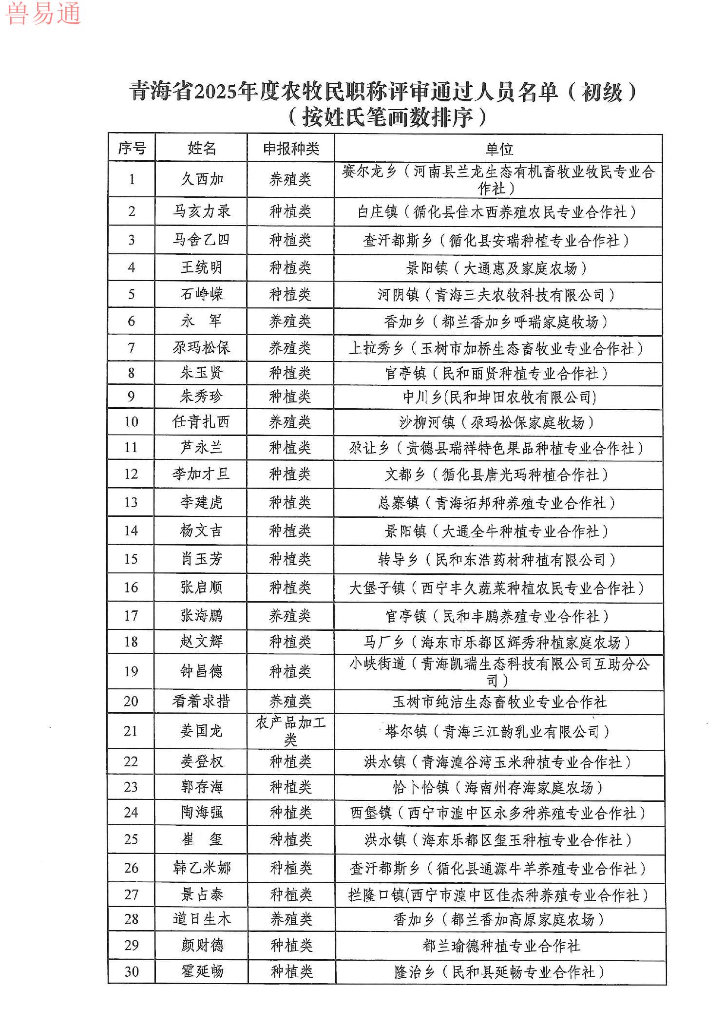 经省农牧民职称评审委员会评审,才本加等40名农牧民拟评定为农牧民高级职称,山发春等43名农牧民拟评定为农牧民中级职称,久西加等30名农牧民拟评定为农牧民初级职称,现将名单予以公示(详见附件)。公示期自2026年3月25日至3月31日(5个工作日),如有异议,请在公示期内署名向省农业农村厅机关纪委、人事处反映。