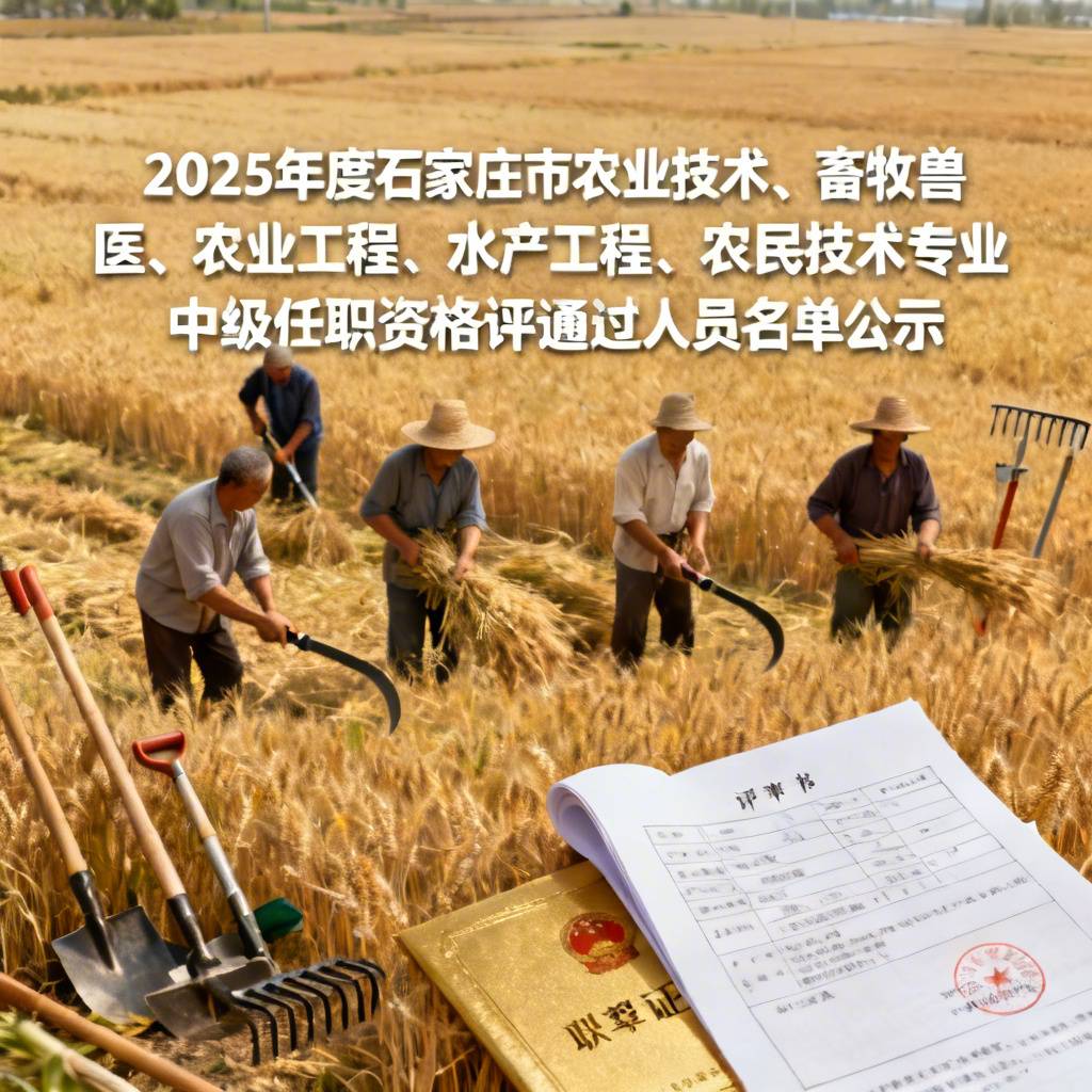 经石家庄市农业技术、畜牧兽医、农业工程、水产工程、农民技术专业技术中级任职资格评审会议评审,现将2025年度农业技术、畜牧兽医、农业工程、水产工程、农民技术专业中级任职资格评审通过人员名单进行公示。公示期间,如有异议向石家庄市农业农村局人事科反映。以单位名义反映问题的应加盖公章,以个人名义反映问题的应署真实姓名。反映情况和问题务求实事求是、客观公正。公示时间:2025年11月17日至2025年11月21日受理单位:石家庄市农业农村局人事科地址:石家庄市建华南大街371号邮政编码:050000联系电话:0311-69117718一、农艺师(33人)郄建鑫、张玉强、樊建春、刘菁、李会香、赵红霞、王龙、陶峰、卢小丽、张彩虹、付晓阳、高静、王妍、张勇、杨西芳、高国明、石永生、门兰芳、胡吉水、王青、边丽慧、张素霞、王丁、赵宇峰、单伟东、梁敬涛、张伟霞、李帆、张素华、闫帅帅、程昕、穆宏伟、李少敏二、畜牧师(3人)王聪敏、翟沛远、池洋三、兽医师(21人)孙亚青、曹哲、张永彬、王敏生、王慧敏、闫宽宽、白彦芳、赵千钧、李涛、张哲、赵健、张军军、史庆华、宋首宏、李亚菲、吴万里、王鸿远、许家兴、于兴华、高翊翔、王颖四、工程师(农业工程专业)(6人)王文辉、李凌、梁普、任玮剑、张潮、谢春江五、工程师(水产工程专业)(1人)孟秋冬六、农艺师(农民技术系列21人)王永良、石军艳、仝夕红、吕博洋、罗丽强、曹建永、高晓旭、贾立剑、韩肖肖、李佳楠、胡三妮、高贵生、杨建利、马秀花、武延军、白海燕、张建军、王月军、张东兵、刘海芳、