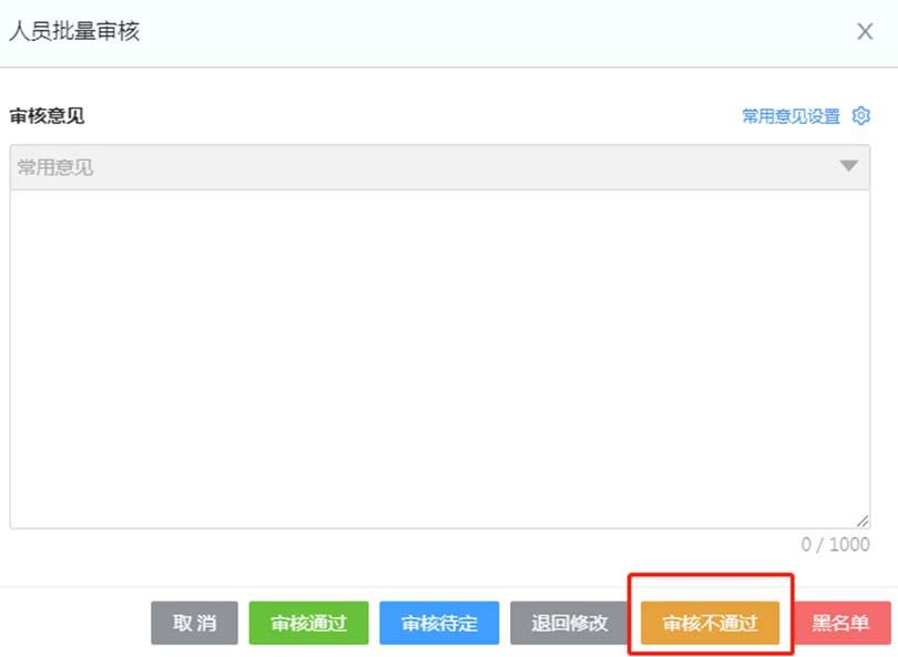 对审核中多人出现共性问题,也可以点击【审核不通过】一并填写审核意见退回。