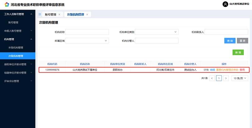 在工作单位界面中 【机构管理】--》【次级机构管理】界面中建立并填写相关信息 如下图