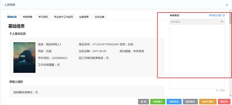 登录单位经办人、单位领导账号后点击申报人信息右边【审核】,弹出申报人申报详细信息页面,界面左边显示申报人所填信息,可以直接在右边对话框即可输入审核意见。