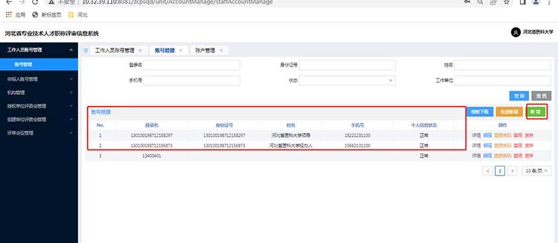 如图,工作人员登录单位管理员帐号后,可进行工作人员账号管理功能(主要是用于创建该单位的经办人帐号及单位领导帐号用于审核申报信息,初始密码是6个8 。