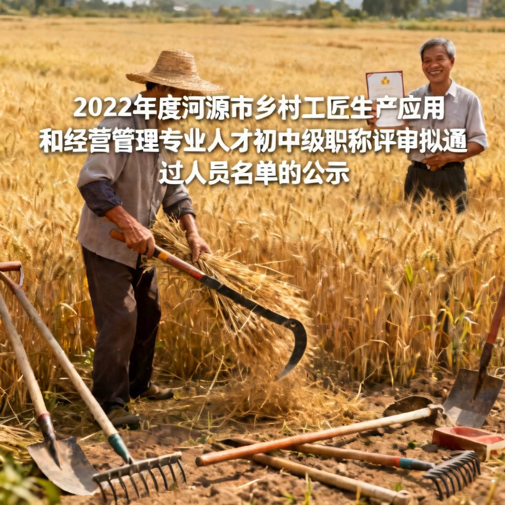 根据《关于做好2022年度乡村工匠专业人才职称评审工作的通知》(粤农农函〔2022〕831号)要求,经河源市乡村工匠生产应用专业人才中级职称评审委员会和河源市乡村工匠经营管理专业人才中级职称评审委员会评审,拟认定冯文渊等39名同志取得乡村工匠生产应用和经营管理专业(初)中级专业技术资格,现予以公示。