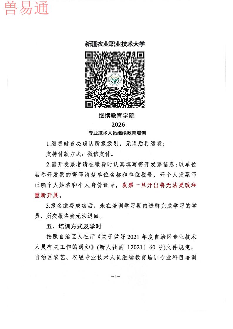 按照自治区人社厅2026年《关于进一步做好自治区专业 技术人员继续教育工作的通知》要求,新疆农业职业技术大 学继续教育基地参照2025年缴费标准执行:拟晋升初级:120 元/年/人,拟晋升中级:160元/年/人,拟晋升正、副高级: 200元/年/人。缴费成功后无法退回,请报名时慎重考虑!